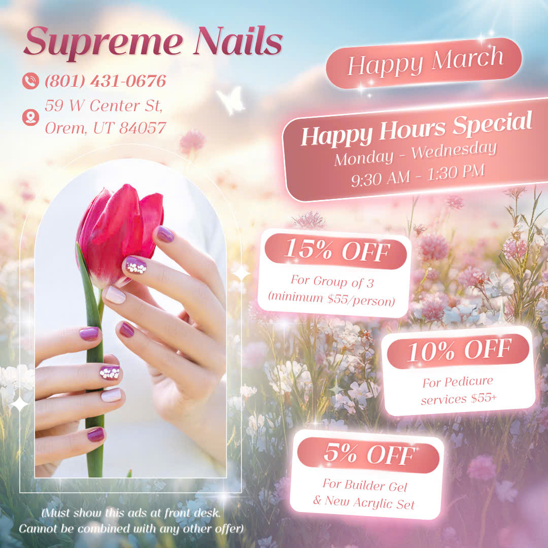 Located conveniently in Orem, UT 84057, our nail salon pleased to provide the clean and welcome atmosphere, which will make you freely enjoy the relax moments and escape from all of life’s pressure to make the most of wonderful time.